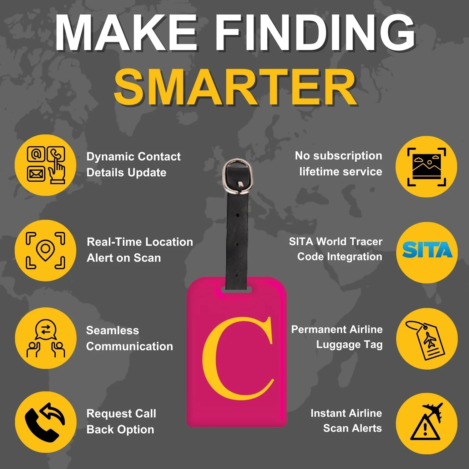 - [Stay in Control of your bags] Update your contact details online anytime, even after your bag is lost, for peace of mind. Relevant both in and outside airline systems, perfect for local travels, and smarter than a name tag - all with no subscription fees!